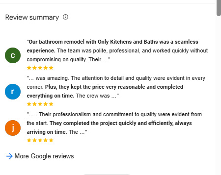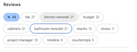 In Google Business Profiles, reviews that include specific language can be highlighted in the Review Summary section of the listing. The above screenshot shows the results I experienced when searching for “bathroom remodel San Francisco”.Â
