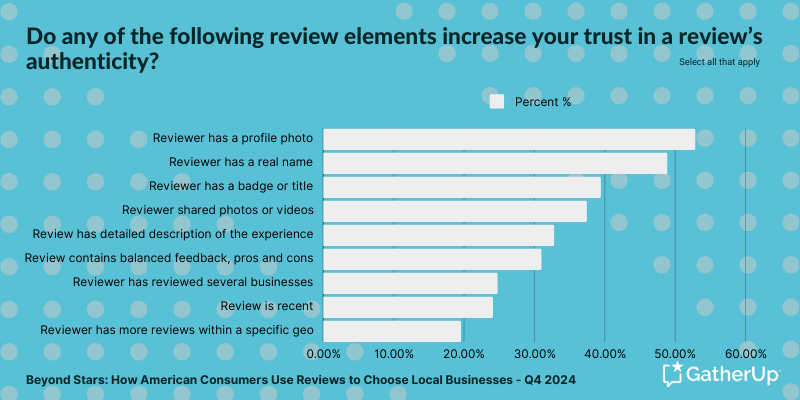 Reviews that contain detailed descriptions of the customer’s experience earn a 33% increase in consumer trust that the review is legitimate, according to this large survey of 1,200+ US consumers I worked on with GatherUp. Given the serious problem of review fraud, reviews that appear authentic will become an increasingly valuable asset if predictions hold true that platforms like Google Business Profile are about to be overrun with AI-generated review content. Note, too, the positive impacts of images and videos on consumer trust seen in the above slide.