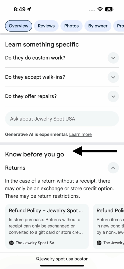 Mike Blumenthal caught a test of an experimental AI-generated GBP feature called “Know before you go” that commenters on his post didn’t seem able to reproduce but which is definitely worth noting. Mike says,