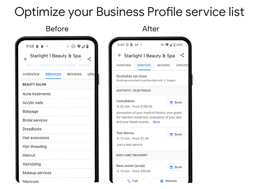 As you can see, the preferred example has written a description of every service including providing a time estimate and booking functionality. It’s great to see Google offering this type of guidance, and this would be a great week to take your own service menus from simple list format to full descriptions.
