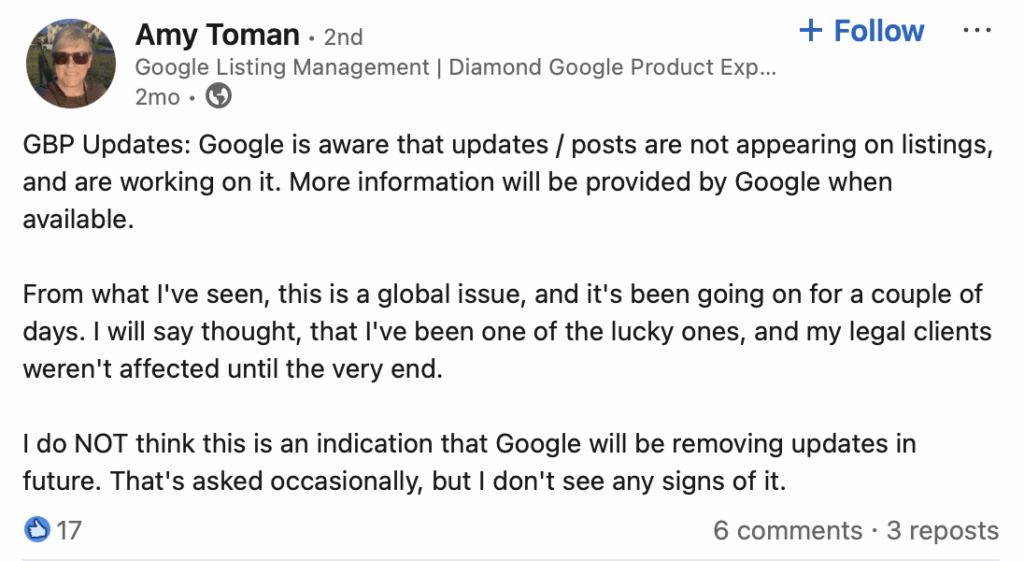 There is a lot of buzz right now about whether Google Updates (formerly known as Posts) may go away at some point, and a bug in May (since resolved) likely contributed to this worry. As reported by Amy Toman, Updates were not publishing on GBPs for a while, but she does not see this as an indication that Google plans to remove this feature. It’s a good indicator of how uncertain local business owners and their marketers feel about the stability of GBP, but every bug tends to make us worry that Google is about to sunset something we count on. It’s always important to remember that Google is constantly tinkering with listing features. Never count too much on any single one of them in your marketing. And speaking of that…