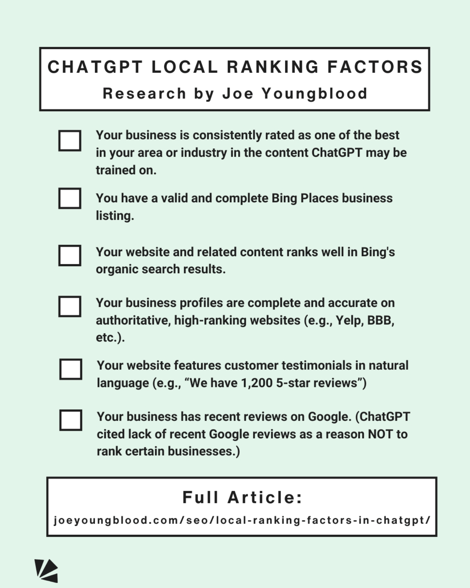 Joe Youngblood offers a valuable early study of possible ChatGPT local business ranking factors, based on his team analyzing the results of 250+ queries that generated local business-type results with a map a list of companies. Whitespark turned Joe’s takeaways into the above graphic for easy scanning. Take special note of the new prominence this list gives to Bing Places and to first-party testimonials.