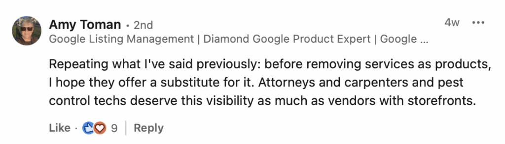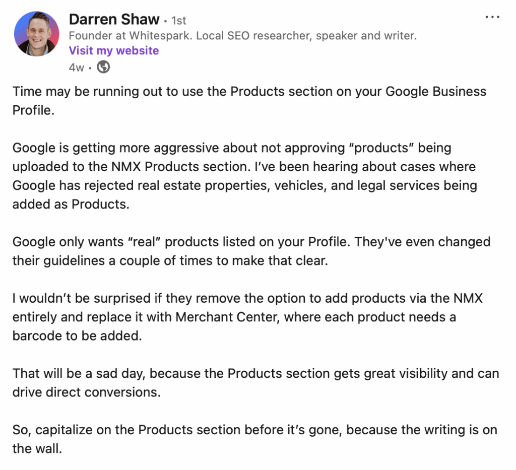 This Linkedin post from Darren Shaw and the many comments it has received capture the uncertainty many local SEOs are feeling about the future of the GBP Products feature. Many of us have used this feature in the past to list services as products, but there are signs that this is going away. Confusingly, though, actual products appear to be getting rejected, as well. Multiple mentions were made of vehicles not being accepted as products. If they aren’t products, what are they? Amy Toman’s comment provides a good summary of what many of us would like to see from Google: