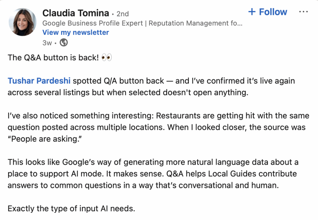 The Q&A button keeps playing hide-and-seek on GBPs, causing much speculation about whether this feature is doomed to be removed. Claudia Tomina amplified a screenshot from Tushar Pardeshi of the Q&A button reappearing, though it did not appear to open anything when clicked on. Lots of people are trying to figure out how Google may be resculpting this GBP functionality to be part of their overall AI-first trend.