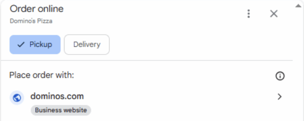 When Joy Hawkins first spotted this in early June, commenters could not replicate with their own searches, but I am now able to see this interface across multiple GBPs. When clicking on the “Order pickup” button for a Domino’s Pizza near me, I get this popup, guiding me to the business’ own website: