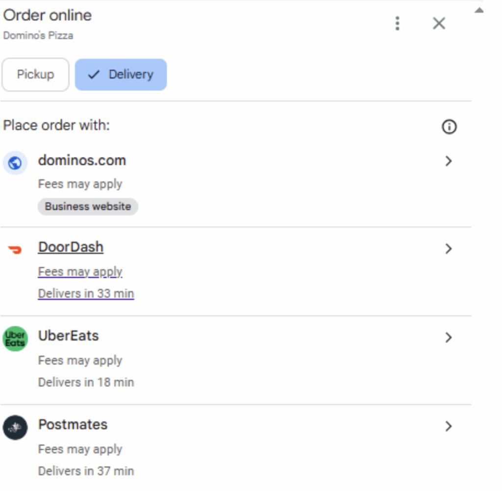However, when I click on the “Delivery” button, the popup features multiple third-party delivery services, including DoorDash, UberEats, and Postmates.