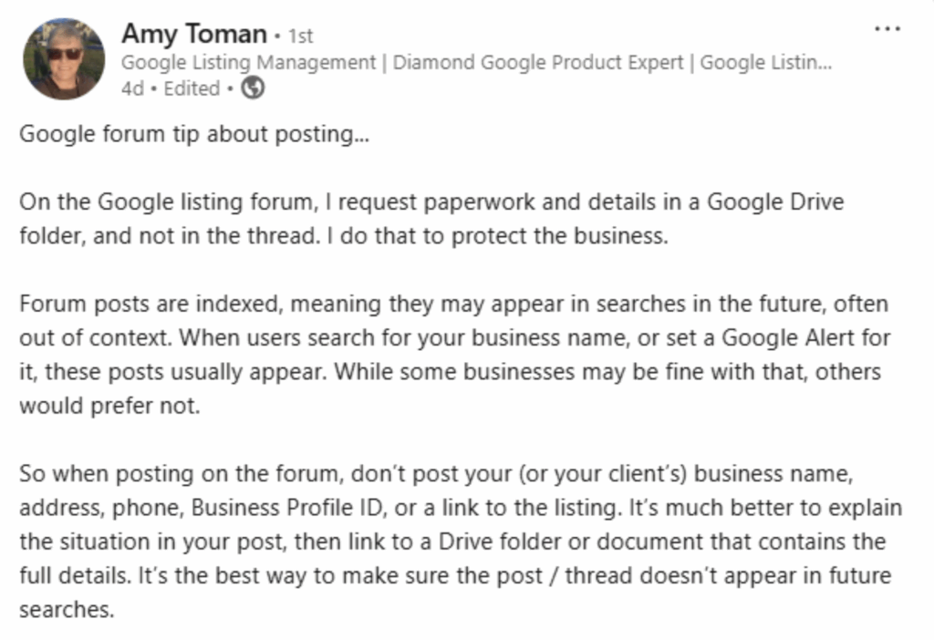 Amy Toman’s role in Google’s forum makes her advice well-worth listening to when she advises local businesses and their marketers not to put full business details directly in your GBP Help Forum posts. As she says, these details can get indexed and may not be what you want out there on the web when folks are searching for your brand. Instead, you can put this information in a Google drive folder or doc for more private viewing.