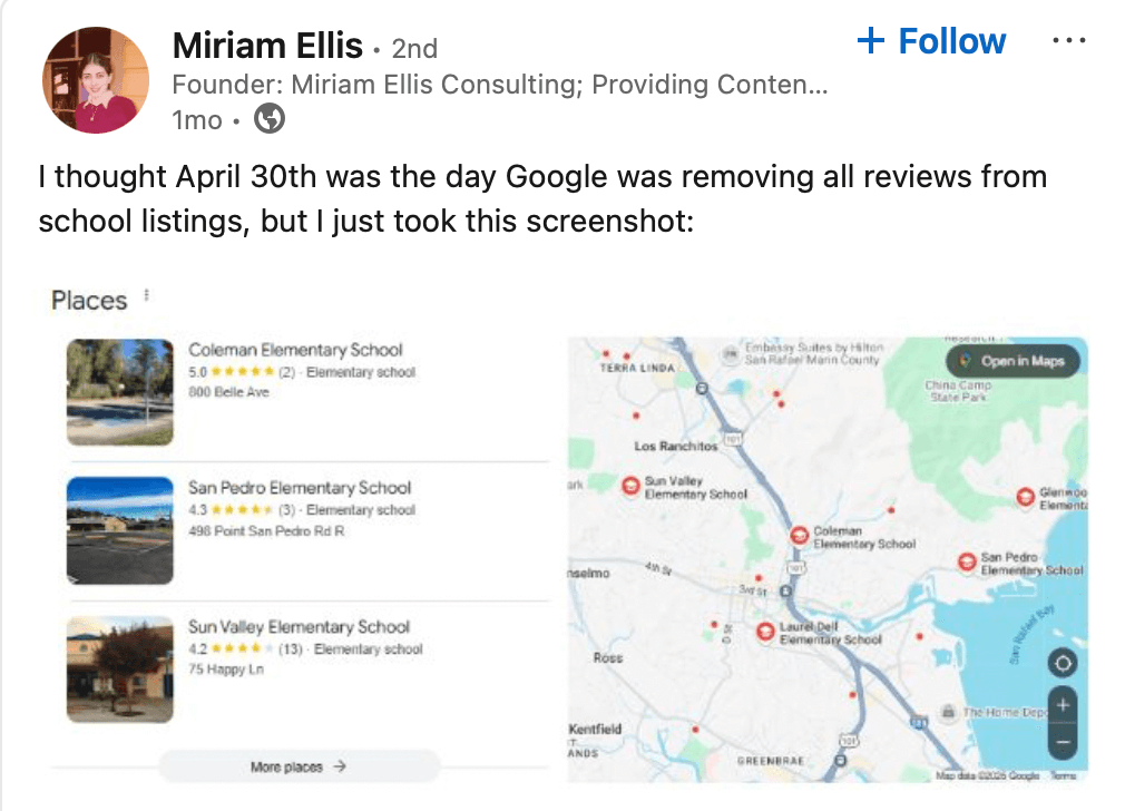 Vinay Toshwinal posted Google’s notice that, as of April 30, 2025, they would be removing reviews and ratings for schools. About a month in, I posted to Linkedin that I was still seeing reviews on school listings: