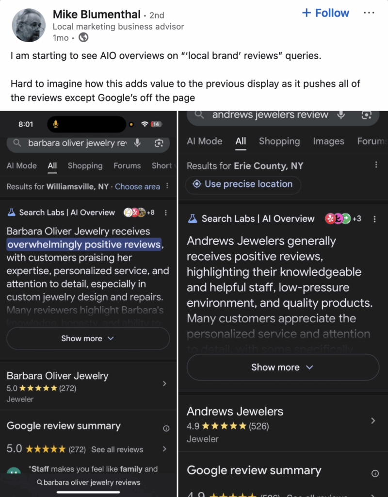 Mike Blumenthal shared screenshots on Linkedin of the kinds of results he is seeing for queries that combine a brand name with the modifier “reviews”. He is skeptical that this display adds value, given that it pushes all reviews other than Google-based reviews off the page.