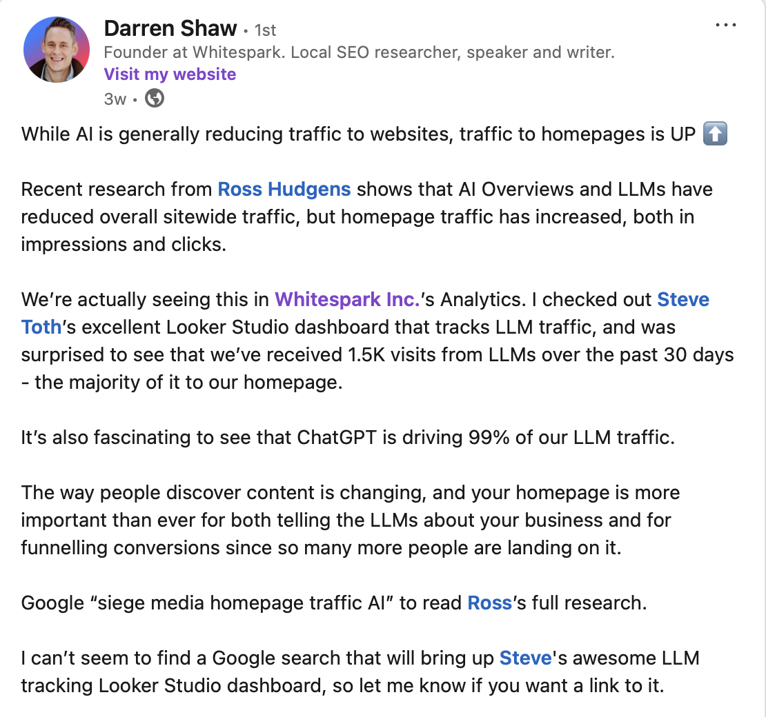 Organic traffic, overall, is dropping but Seige Media published a must-read study on a 10.7% uptick to homepage traffic, due to LLMs, and Darren Shaw confirmed this trend with Whitespark’s own analytics. My takeaway here is that local brands may need to begin rethinking homepage components. Small-to-enterprise level brands often use homepages as a kind of succinct summary of the business; a jumping-off point for website exploration. We could see a trend shaping up of websites needing to offer both a deeper dive into local business content and more emphasis on homepage conversion factors.