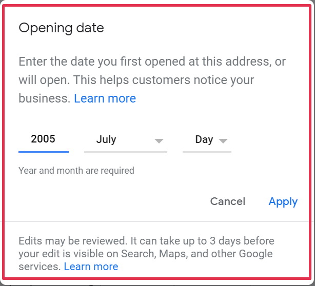 If you have multiple locations, it’s up to you whether you add the date your business started or the date you opened at that location. Keep in mind that Google often uses this information to display a note on your profile that says, “__ Years in Business” which can build trust with searchers: