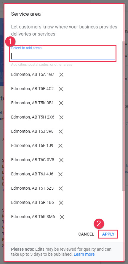 If customers do not come to you then you will need to set a service area based on the regions, cities, Zip/Postal Codes, or districts that your business serves. When updating your business information, you have the option of entering your address, service area, or both.