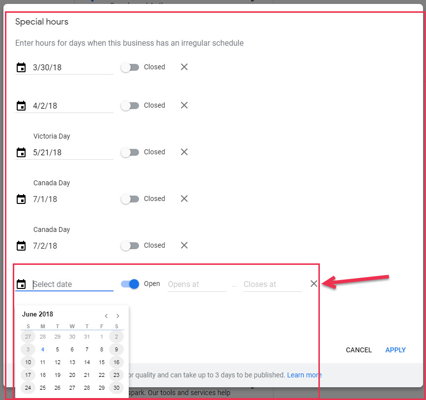Add your regular business hours. Also make sure to use the Special Hours feature so that you can prepare in advance for holiday hours, or irregular/one-off changes in business hours for team days, events, and so on.