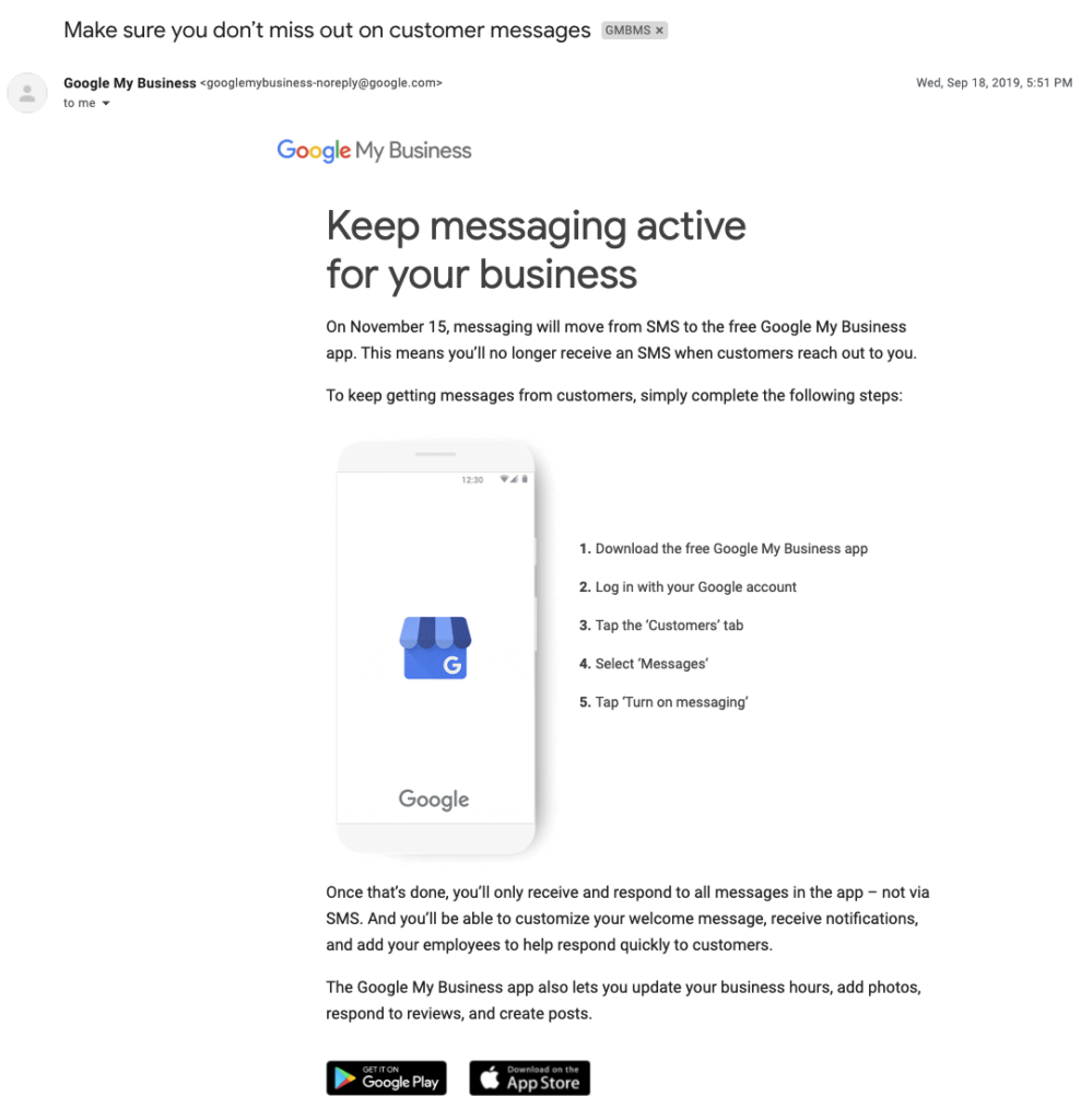 In September 2019, Google started to toggle off the functionality of this feature when a business is unresponsive. For businesses already using Messaging via SMS, nothing changed until November 2019 when Google announced āmessaging will move from SMS to the free Google My Business app.ā