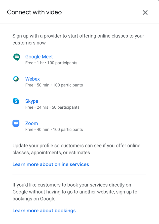 This functionality is a further extension of our online services announcement earlier this year. Merchants can already note on their Business Profiles that they offer virtual services and add links for booking online appointments. We’re testing some new functionality to help merchants easily get started with video conferencing providers so they can begin offering virtual services. There’s no change to what’s displayed on the Business Profile.”