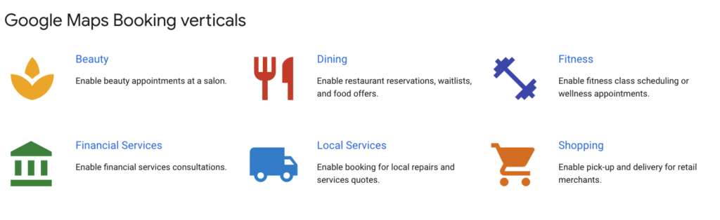 There are currently six verticals Bookings is available for: fitness, beauty, dining, financial services, local services and shopping. Fitting into one of these verticals does not guarantee you’ll be able to use this feature though.