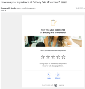 Bonus: Once the booking time has passed, Reserve with Google will send an email asking for a Google review! It also has a quick link to rebook your next appointment through Reserve with Google.