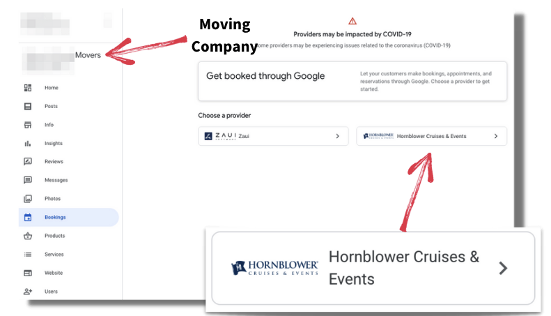 Here, a moving company’s options to use the Booking feature include Hornblower Cruises & Events: