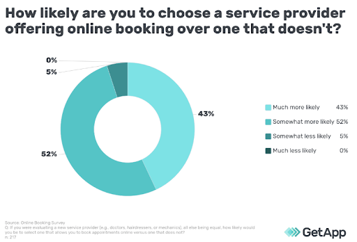 A 2021 study by GetApp found that 59% of those surveyed find scheduling by phone frustrating and 95% said they were more likely to choose a new service provider if that provider offered online booking.