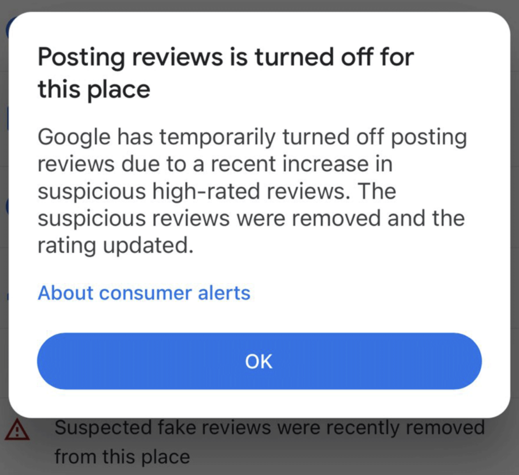 Because of the significant impact of reviews on consumer behavior, local search rankings, and brands’ bottom lines, some business owners exploit Google’s system and violate their countries’ legal rulings by engaging in review-related tactics with the goal of fooling the public. If caught, the business may not only find its Google Business Profiles labeled with warnings like the one captured above by Mike Blumenthal, but it may also become subject to lawsuits and fines.