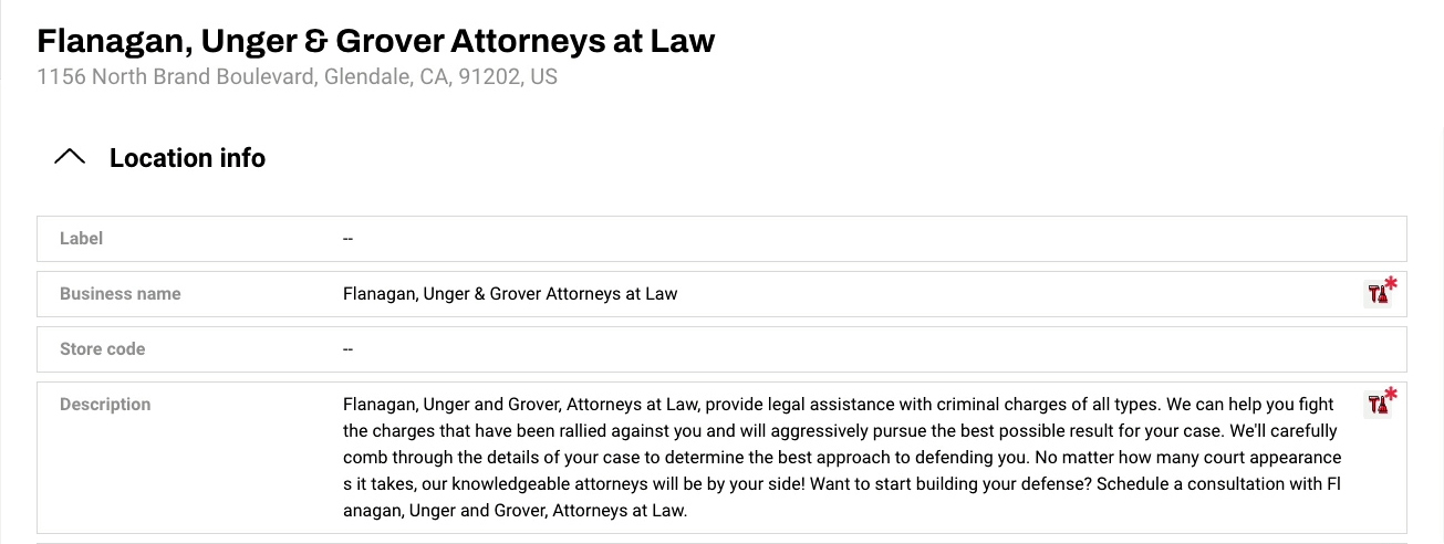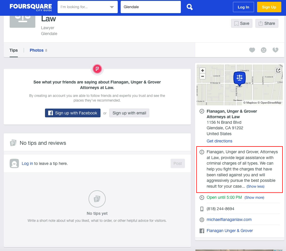 So, in this case, Flanagan, Unger and Grover are not feeding Google the food that it needs to understand their business. That’s your goal here with the description. Get additional keywords in there, so that you can tell Google what your business is about and what keywords you want to rank for.